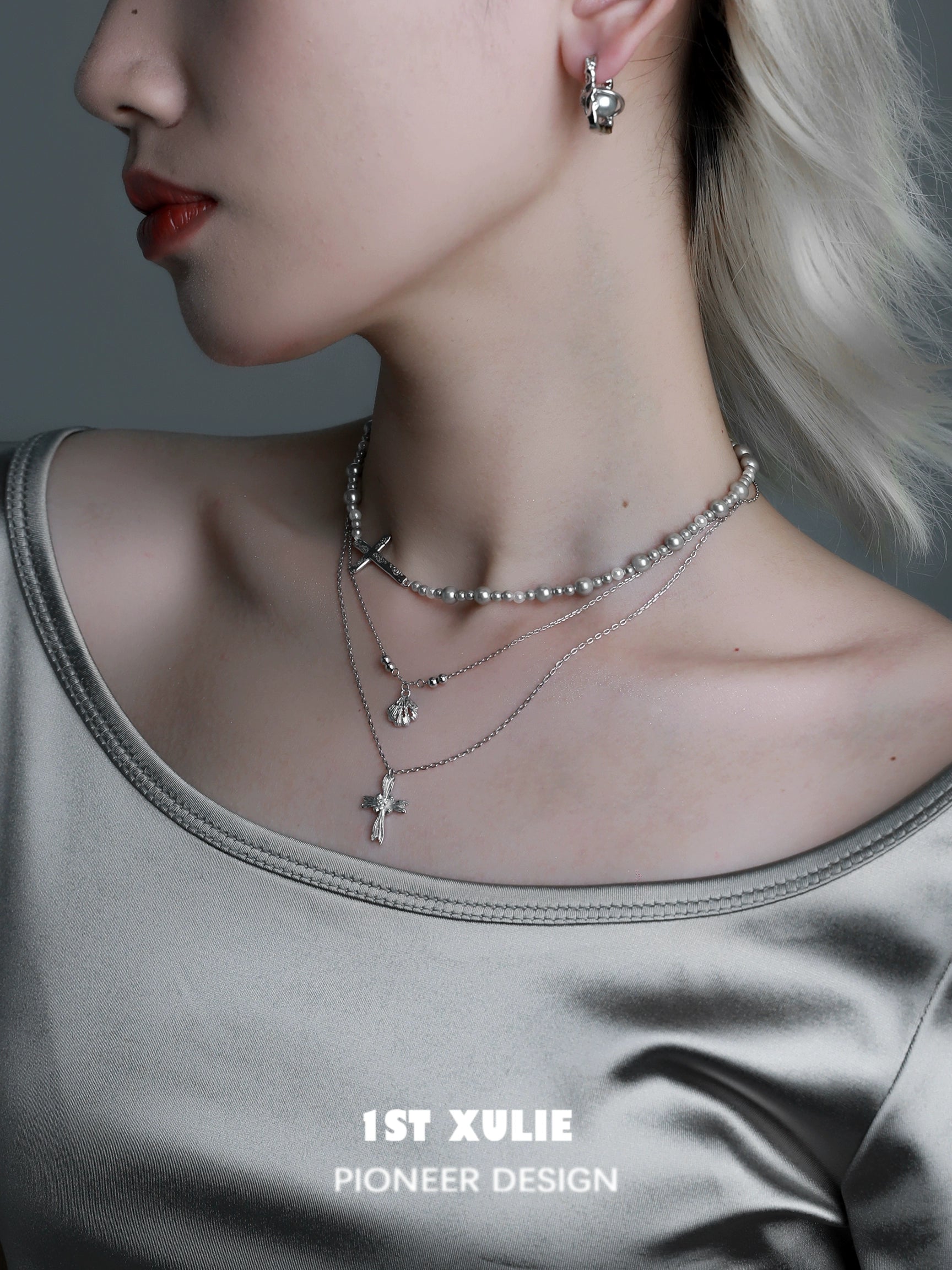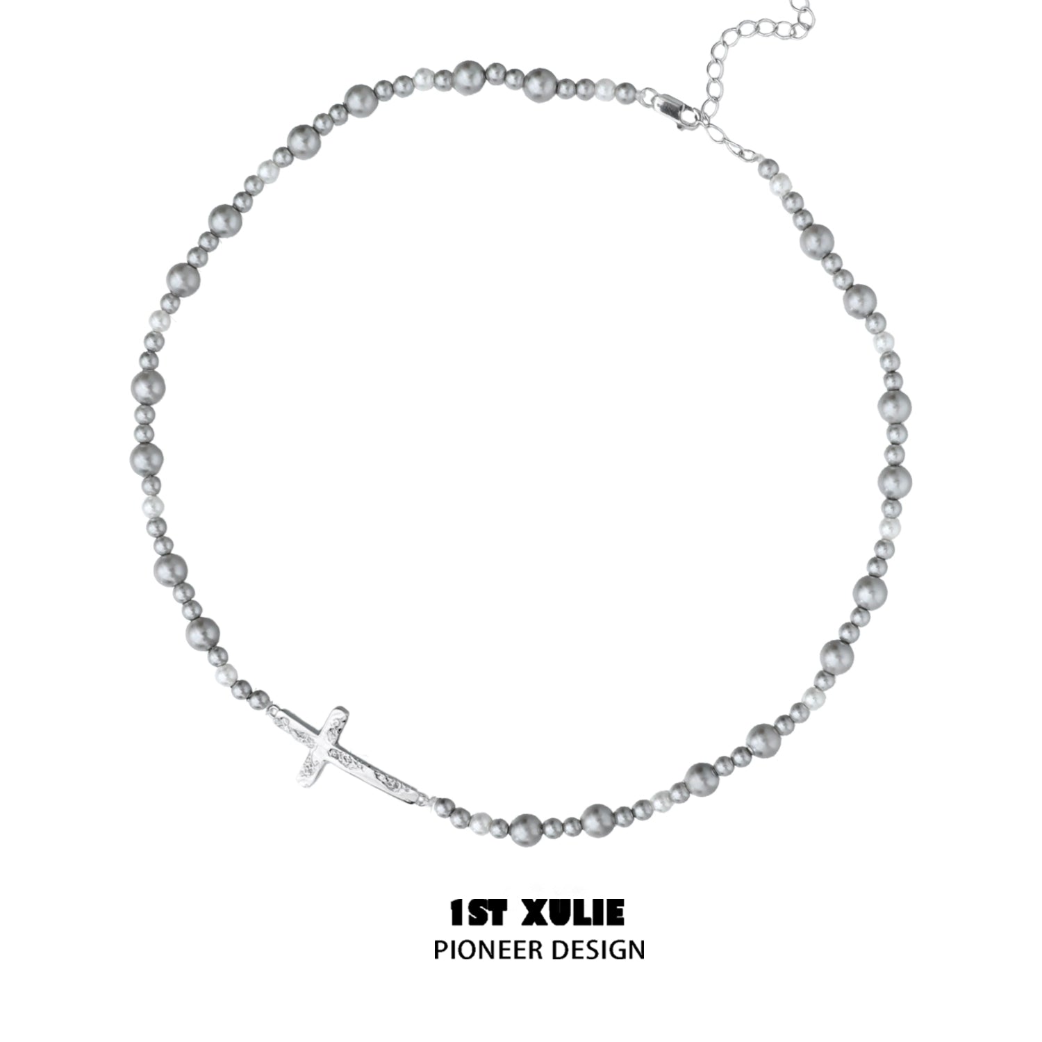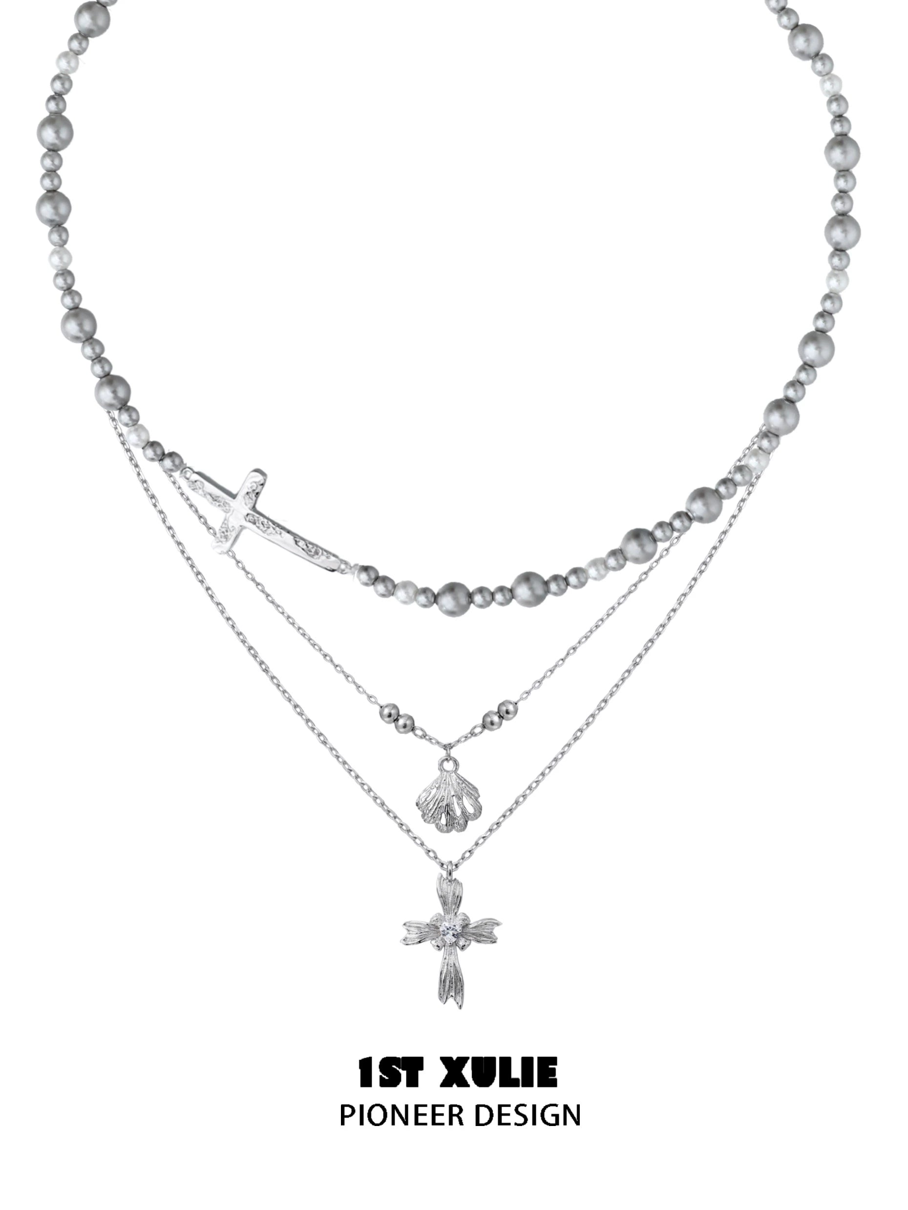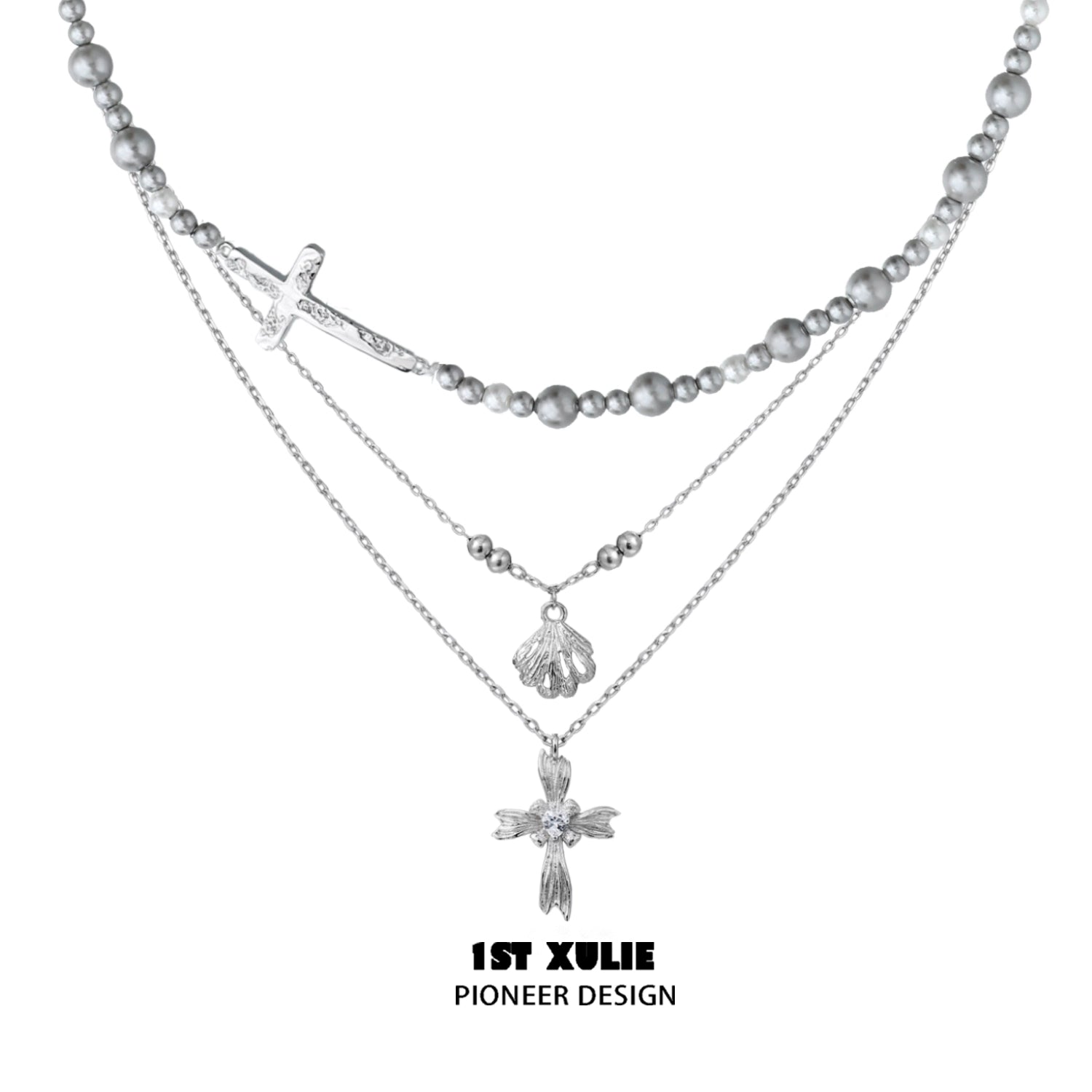 Necklaces-1STXULIE Gray Pearl Sterling Silver Necklace Does Not Fade Original Niche Design Premium Cross Double Clavicle Chain